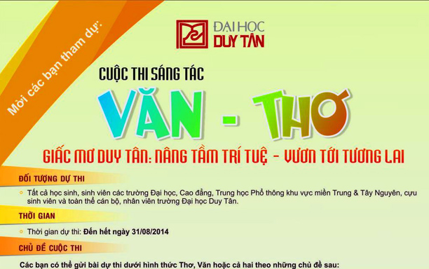 (ictdanang)- Hướng đến Kỷ niệm 20 năm thành lập Đại học Duy Tân, Đại học tư thục đầu tiên và lớn nhất tại miền Trung; bên cạnh hàng loạt sự kiện-hoạt động với các cấp độ quy mô khác nhau đã-đang-và sẽ được Đại học này tổ chức; một cuộc thi sáng tác Thơ-Văn với chủ đề “Giấc mơ Duy Tân - Nâng tầm trí tuệ - Vươn tới tương lai”, đã chính thức được phát động.