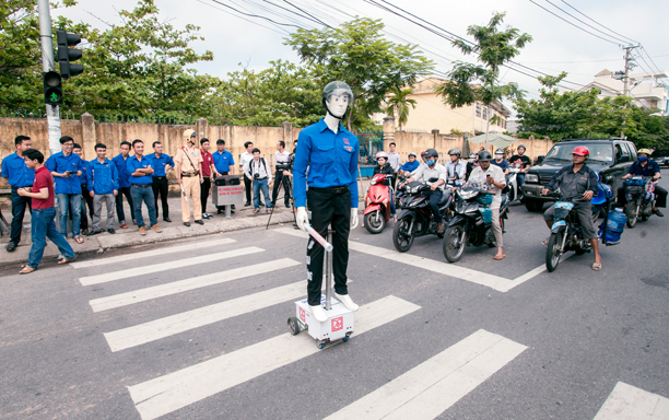 Ngày 31/3, Quận đoàn Hải Châu và Đoàn trường Đại học (ĐH) Duy Tân, Đà Nẵng phối hợp tổ chức thử nghiệm robot dẫn người qua đường và cảnh báo dừng xe sai vạch tại ngã tư đường Lê Thanh Nghị - Phan Đăng Lưu, nhằm khuyến khích phong trào nghiên cứu khoa học mang tính ứng dụng thực tế và tuyên truyền nâng cao ý thức an toàn giao thông.