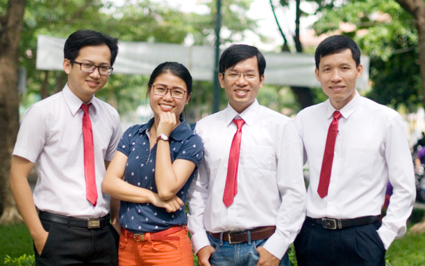 | Nhóm vật lý hạt nhân ĐH Duy Tân (từ trái qua): ThS Lê Tấn Phúc, ThS Phạm Thị Thùy Giang (cộng tác viên), TS Trần Hoài Nam (trưởng nhóm) và PGS.TS Nguyễn Quang Hưng |