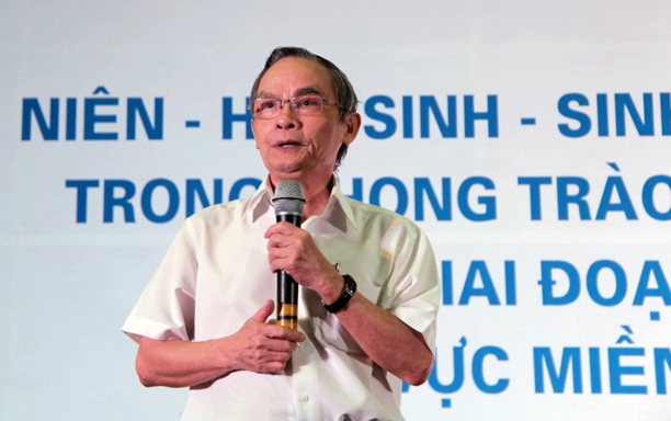 Nhà giáo ưu tú Lê Công Cơ - một trong hai tác giả của tập sách - phát biểu tại Đêm sinh hoạt kỷ niệm Ngày truyền thống Học sinh-Sinh viên (9 tháng 1) và ôn lại lịch sử Phong trào đấu tranh yêu nước của Thanh niên - Học sinh - Sinh viên - Trí thức - Văn nghệ sỹ trước 1975. Ảnh: Nguyệt Quế.