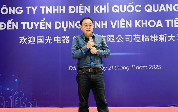 Phát biểu tại chương trình, ông Lưu Lỗi - Giám đốc Trung tâm Sản xuất, Công ty TNHH Điện khí Quốc Quang (Việt Nam) cho biết: “Chúng tôi không chỉ là một doanh nghiệp, mà còn là một ‘sân khấu’ để các bạn trẻ thể hiện tài năng và hiện thực hóa ước mơ của mình. Nếu bạn có hoài bão về tương lai, có mục tiêu và ước mơ muốn theo đuổi và nếu câu trả lời là ‘có’, thì Quốc Quang chính là đáp án mà bạn đang tìm kiếm. Hiện nay, tại công ty chúng tôi có khoảng 159 sinh viên Đại học Duy Tân đang làm việc, trong đó khoảng 10% các bạn tốt nghiệp từ trường đang đảm nhiệm những vị trí quan trọng. Ngay khi gia nhập công ty, mỗi bạn sẽ được ghép nối với một cố vấn giàu kinh nghiệm, hướng dẫn 1:1 để nhanh chóng hòa nhập với đội ngũ và nắm vững các kỹ năng cốt lõi. Kinh nghiệm từ công việc đầu tiên không chỉ dừng lại ở một mức lương, mà còn là vạch xuất phát cho sự nghiệp của bạn. Chúng tôi mong muốn cùng các bạn thắp lửa sáng tạo bằng đam mê và định nghĩa tuổi trẻ bằng chính nỗ lực của mình.”
