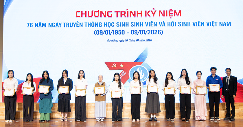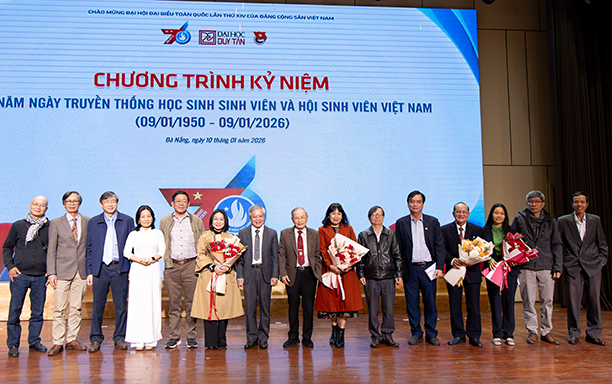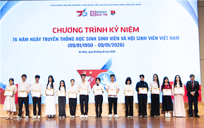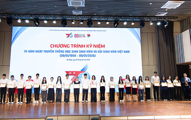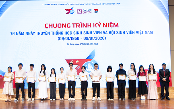 Sáng ngày 10/1/2026, Đại học Duy Tân đã tổ chức Lễ Kỷ niệm 76 năm Ngày Truyền thống Học sinh - Sinh viên và Hội Sinh viên Việt Nam (09/01/1950 - 09/01/2026), đồng thời tuyên dương, khen thưởng các tập thể và sinh viên có thành tích xuất sắc trong năm học 2024 - 2025.